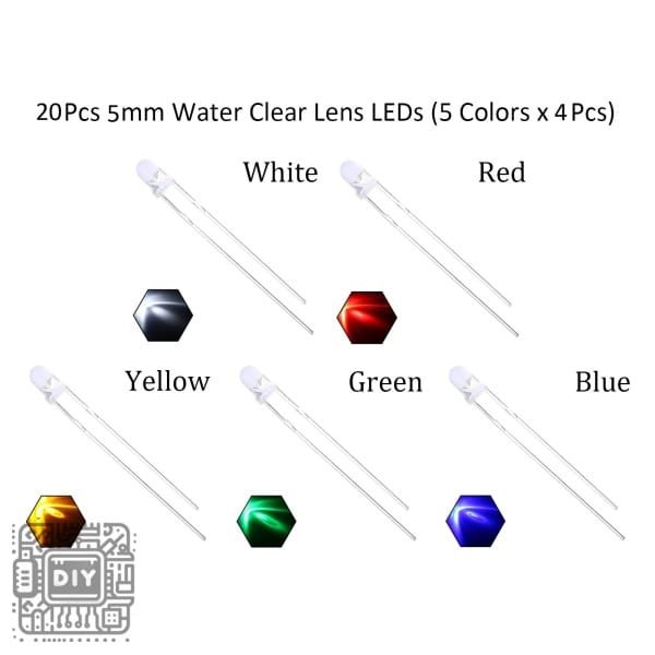 Illuminate your electronic creations with this comprehensive assortment of 20 F5mm Water Clear LEDs. This value pack features five distinct colors – vibrant Red, Yellow, Green, Blue, and pure White – giving you complete flexibility for all your prototyping needs. These LEDs feature “water clear” lenses that remain transparent when unpowered and emit intense, brilliant light when activated, creating a modern, professional appearance perfect for status indicators, panel lights, DIY projects, and educational demonstrations. With their standard 5mm diameter and long, easy-to-solder leads, these LEDs are essential components for makers, hobbyists, and engineers working on everything from simple circuits to complex lighting installations.