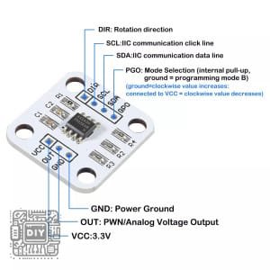 مصمم للتكامل السلس مع أنظمة المتحكم الدقيق، تتميز الوحدة بواجهات إخراج I2C وتناظرية، مما يوفر مرونة لمتطلبات التطبيق المختلفة وهندسات النظام. توفر واجهة I2C قراءة زاوية رقمية مباشرة مع عنوان قابل للتكوين (0x36 افتراضي)، بينما يوفر الخرج التناظري جهدًا proportional للوضع الزاوي للتحويل التناظري إلى الرقمي البسيط. تعمل الوحدة على نطاق جهد wide من 3.3 فولت إلى 5 فولت تيار مستمر وتتضمن جميع مكونات الدعم necessary including مقاومات pull-up ومكثفات فصل للتشغيل المستقر. يتميز تصميم PCB المضغوط برؤوس دبوس موسومة clearly وتباعد قياسي 2.54 مم، مما يضمن التوصيل السهل بـ Arduino و ESP32 و STM32 و Raspberry Pi ومنصات التطوير الشهيرة الأخرى.