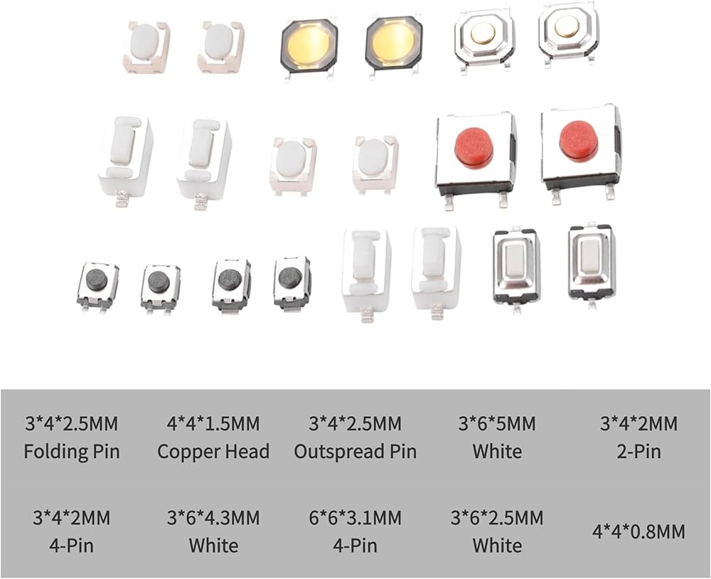 تتضمن جميع أحجام مفاتيح اللمس الأساسية العشرة: 3x4x2.0 مم، 3x4x2.5 مم، 3x6x4.3 مم، 3x6x5.0 مم، 4x4x0.8 مم، 4x4x1.5 مم، و 6x6x3.1 مم للتعامل مع 95% من سيناريوهات إصلاح أجهزة التحكم عن بُعد للسيارة.