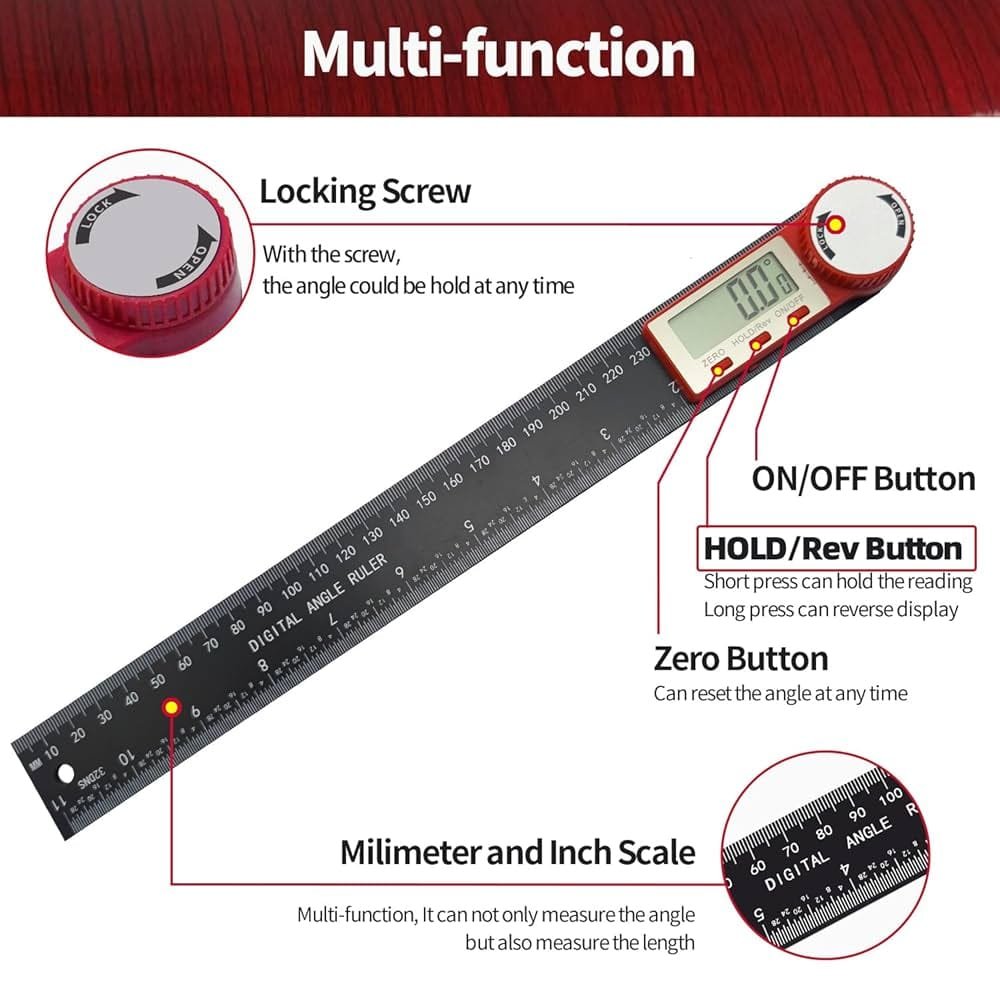 Simplify your precision work with the 2-in-1 Digital Angle Finder, a versatile and essential tool for professionals and DIY enthusiasts alike. This innovative device combines the functions of a digital inclinometer and an angle ruler into one compact unit, eliminating the need for multiple tools. Featuring a high-precision sensor, it provides instant and accurate measurements of angles, slopes, and inclines with a resolution of 0.1°. The large, backlit LCD display ensures clear readability in any lighting condition. Use it as a standalone inclinometer to measure relative angles or lock the stainless steel ruler to measure absolute angles from 0 to 360°. Perfect for woodworking, metalworking, construction, HVAC installation, and machinery alignment, this digital goniometer delivers professional-grade accuracy for any project.