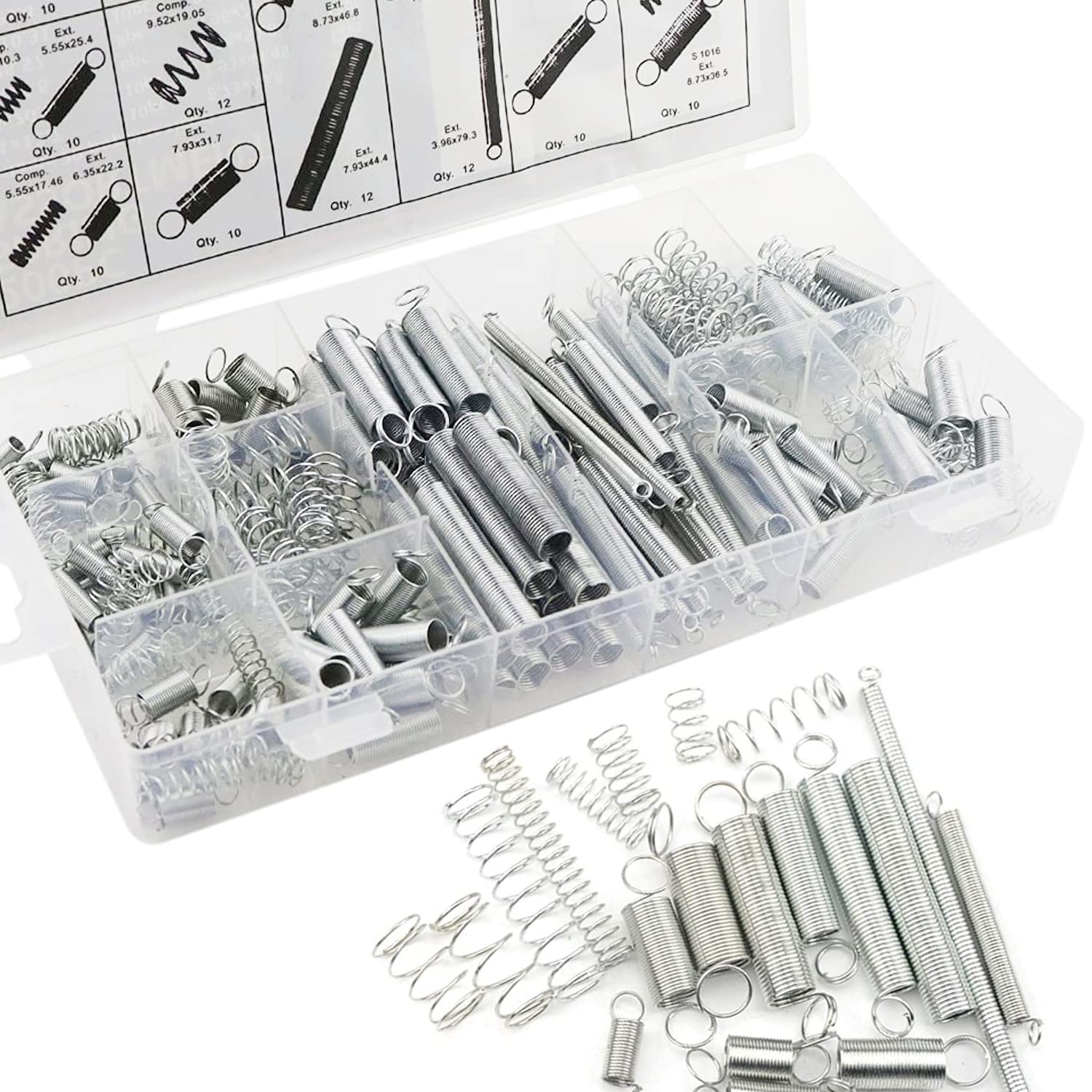 The complete assortment arrives organized in a convenient compartmentalized storage box, keeping your springs sorted by size for quick identification and easy access when time matters most.
