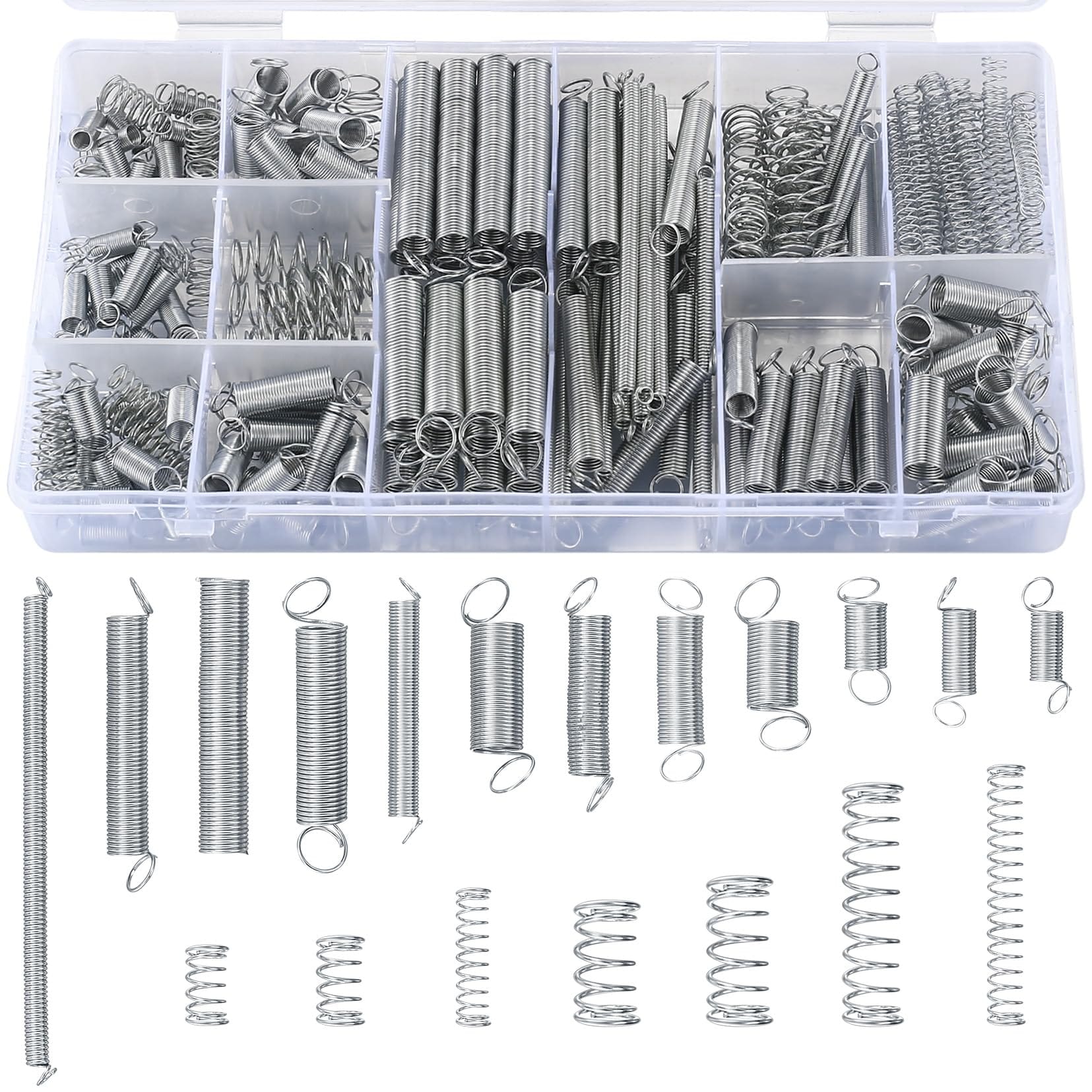 • Spring Types: Spiral Coil Compression Springs (primarily) / Some kits may include both compression and extension springs