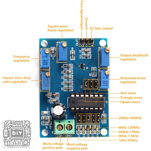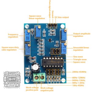 This compact module includes clearly labeled interfaces for power input and signal output, with jumper selectors for choosing between the three waveform types and the five frequency sub-ranges. Whether you’re testing audio amplifiers, calibrating equipment, driving piezoelectric elements, or learning about waveform generation, this ICL8038-based signal generator provides the reliability and versatility you need.