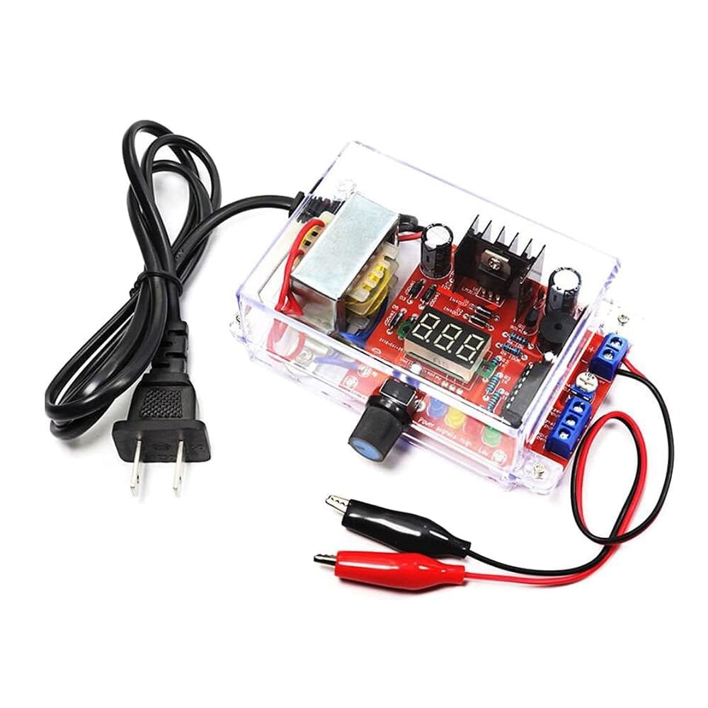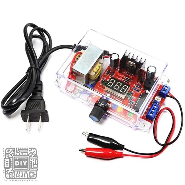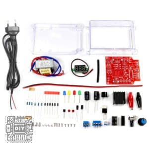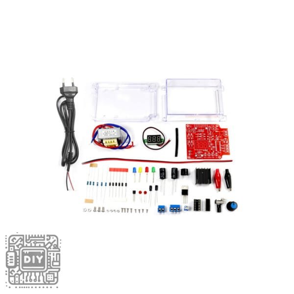 يتضمن جميع المكونات الإلكترونية اللازمة للتجميع: IC LM317، لوحة PCB، مقاومات، مكثفات، مقياس جهد، ثنائيات مقوم، كتل طرفية، ومشتت حراري للمنظم. لا حاجة لأجزاء إضافية.