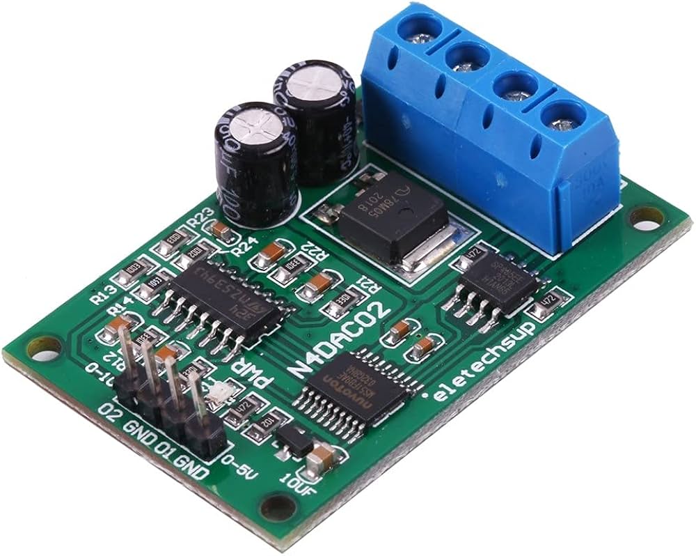 Add precise analog voltage control to your industrial automation, PLC, or home automation projects with the N4DAC02 2-Channel PWM to Analog DAC Converter Module. This compact RS485 module converts digital Modbus RTU commands into two channels of isolated analog voltage output, providing a cost-effective solution for controlling variable frequency drives, actuators, valves, and other industrial equipment requiring 0-5V or 0-10V control signals.