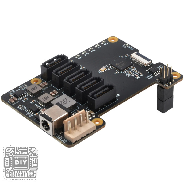 يتضمن مدخل طاقة DC 12V مخصص لتشغيل محركات الأقراص الصلبة المتصلة، مما يضمن تشغيلًا مستقرًا حتى مع محركات متعددة عالية الطاقة. تسحب اللوحة أيضًا طاقة 5V من Raspberry Pi لدوائر المنطق.