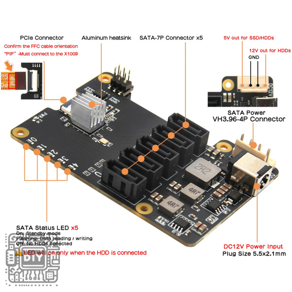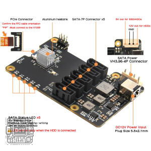 Raspberry Pi 5 X1009 Expansion Board ---------------- --------------------- PCIe FFC Connector -----> PCIe FFC Connector 5V GPIO (optional) -----> Logic power (from Pi) 12V DC Power Supply -----> 12V DC Barrel Jack (5A or higher recommended) SATA HDD/SSD (x5) -----> SATA Ports 1-5