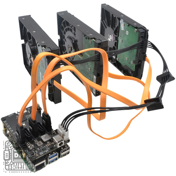 (Raspberry Pi 5, SATA drives, and 12V power supply sold separately)