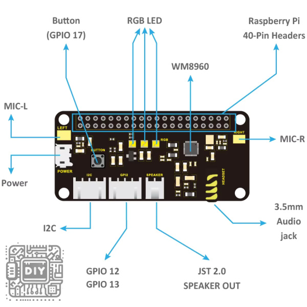 Powered by the WM8960 low-power stereo codec, providing professional-grade audio processing for both recording and playback with support for sample rates up to 48kHz.