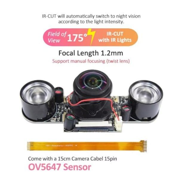 - 1 x 5MP OV5647 Camera Module (175° Wide Angle, MF, Auto IR-CUT)