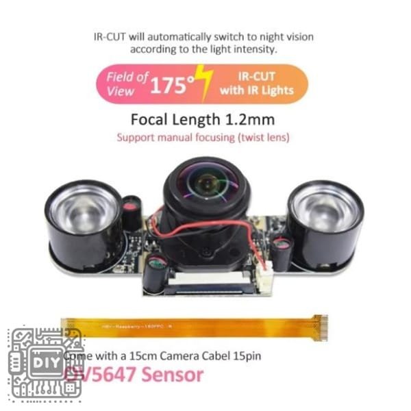 Unlock the full potential of your Raspberry Pi projects with this advanced 5-megapixel (5MP) camera module featuring the reliable OV5647 sensor. Designed for seamless compatibility with the new Raspberry Pi 5, as well as Pi 4, Pi Zero, and older models, this module is your all-in-one solution for both daylight and low-light surveillance and photography. The standout feature is the ultra-wide 175° Fisheye lens and built-in Infrared (IR) Night Vision capability, ensuring you capture a massive field of view with clarity, even in complete darkness. The module includes an Auto IR-CUT filter to eliminate the common reddish tint in daytime footage, providing true-color images during the day and powerful infrared vision at night. Perfect for home security systems, robotic vision, time-lapse video, and panoramic photography projects.